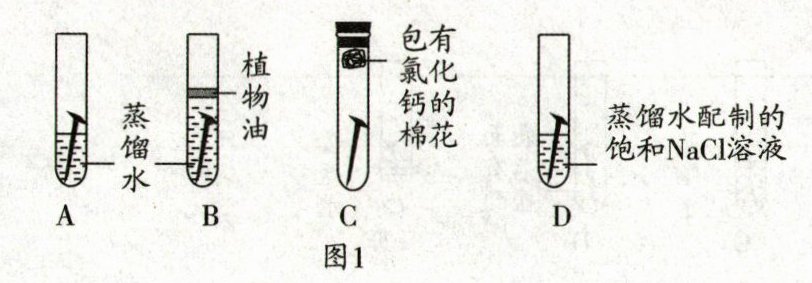 。通过对比 A、D 试管中实验现象,发现铁锈蚀快慢与饱和 $ \text{NaCl} $ 溶液有关,于是设计了如下实验。
