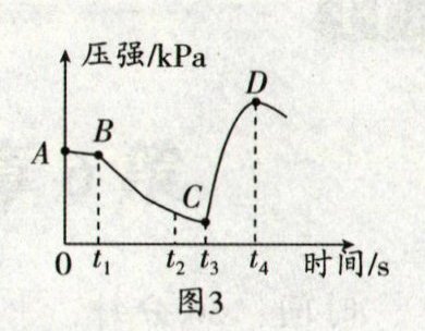 小组设计了图 2 装置,检查气密性后,将 5 g 铁粉和 2 g 炭粉加入三颈烧瓶。 $ t_1 $ 时刻加入 2 mL 饱和 $ \text{NaCl} $ 溶液。一段时间后,再用注射器将 5 mL 稀盐酸注入三颈烧瓶中。整个过程采集的数据如图 3。