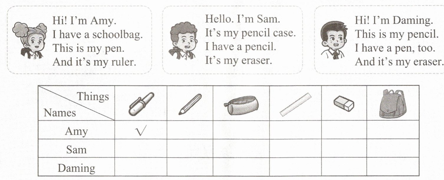 10 Read and write “√”. 读一读,在人物与对应的物品方框中打“√”。