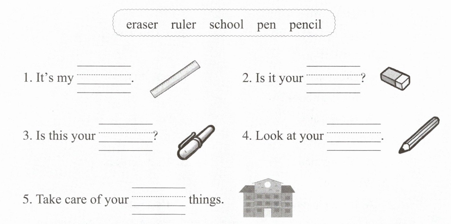 1. ruler 2. eraser 3. pen 4. pencil 5. school