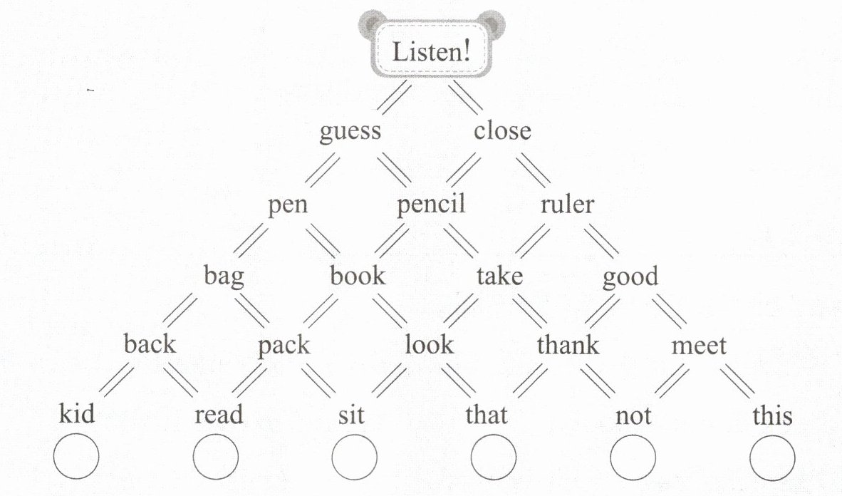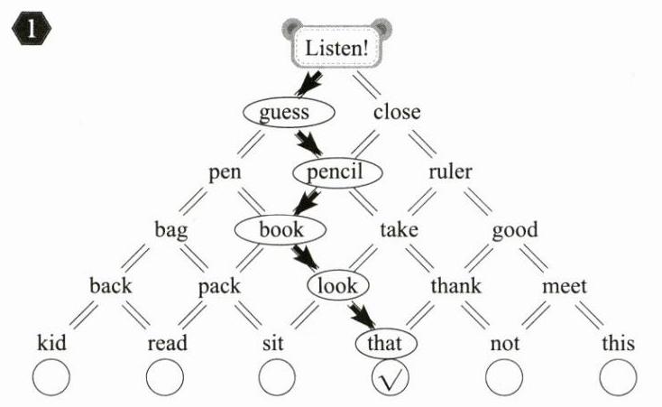 1 Listen, circle and write “√”. 听录音,圈单词,找到路线并在圆圈中打“√”。