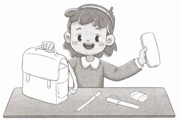 Look! This is my schoolbag. It's red. My pen is blue. My pencil is pink. That is my yellow eraser.