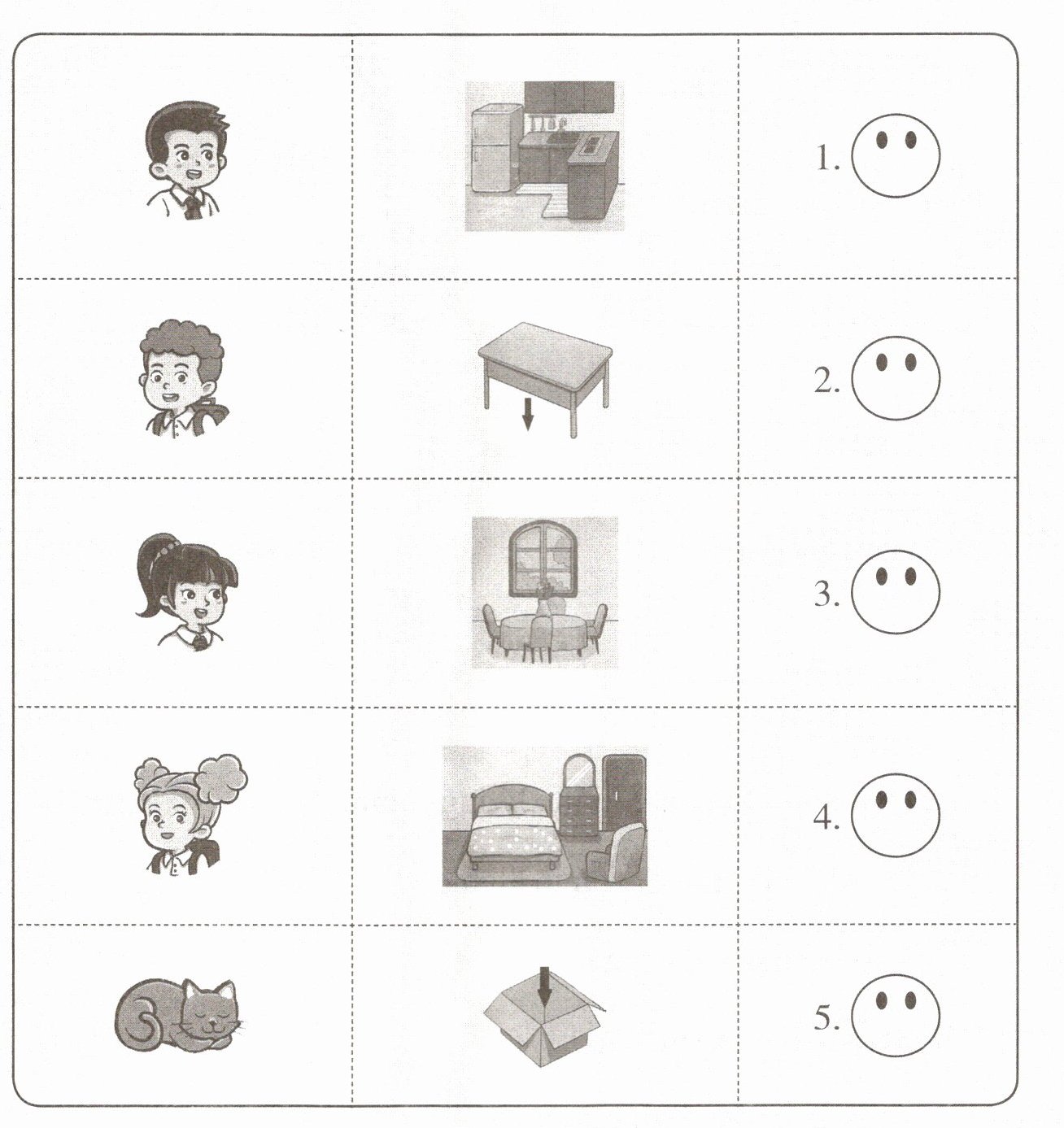 The kids play a game. Guess! Where are they? Let's open the doors and see. Daming is in the dining room. Sam is under the table. Lingling is in the living room. Amy is in the bedroom. Where is Mimi? Miaow... Look! It is in the box.