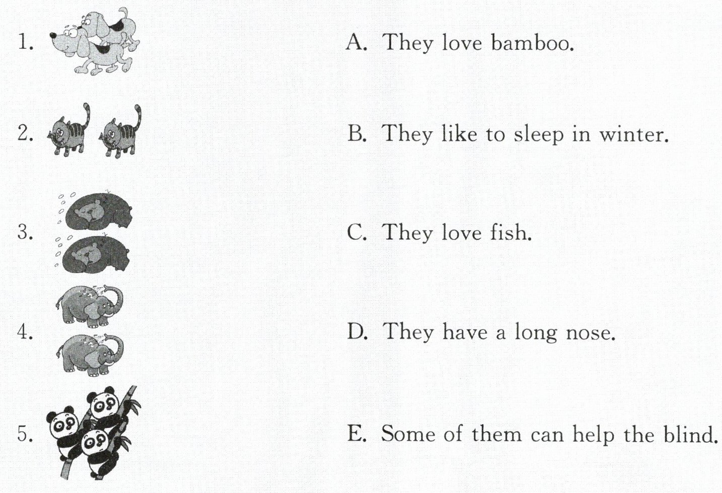 1. panda 2. elephant 3. monkey 4. snake 5. bear 6. fish