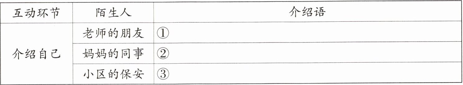 (1)(示例)①您好,我是××老师的学生。②阿姨(叔叔),您好,我是××的孩子。③叔叔,您好,我是咱们小区×号楼×单元的住户。