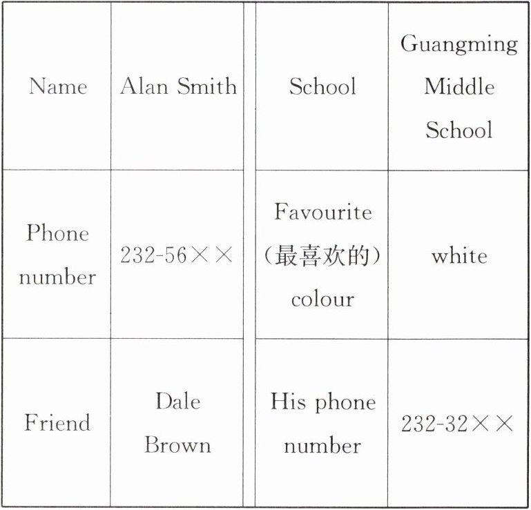 My name is Alan Smith. I am a student at Guangming Middle School. My phone number is 232-56××. My favourite colour is white, and I often wear white clothes. I have a good friend. His name is Dale Brown, and his phone number is 232-32××. We often play together after school. I am happy to study and live here.