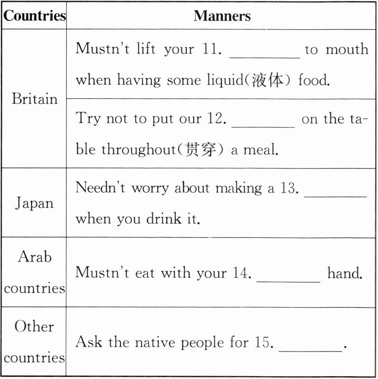 (三)听力填词:请听下面一段独白。根据所听到的内容,写出可以填入下表 11 至 15 空格中的适当单词,每空限填一词。(独白读两遍)