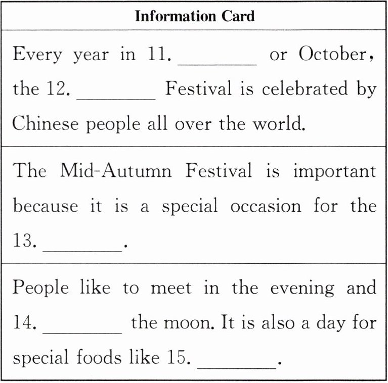 11. September 12. Mid-Autumn 13. family 14. watch 15. mooncakes