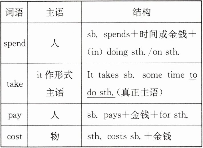 sth.。表示"花费"的动词有 spend,take,pay 和 cost。辨析如下:【运用】