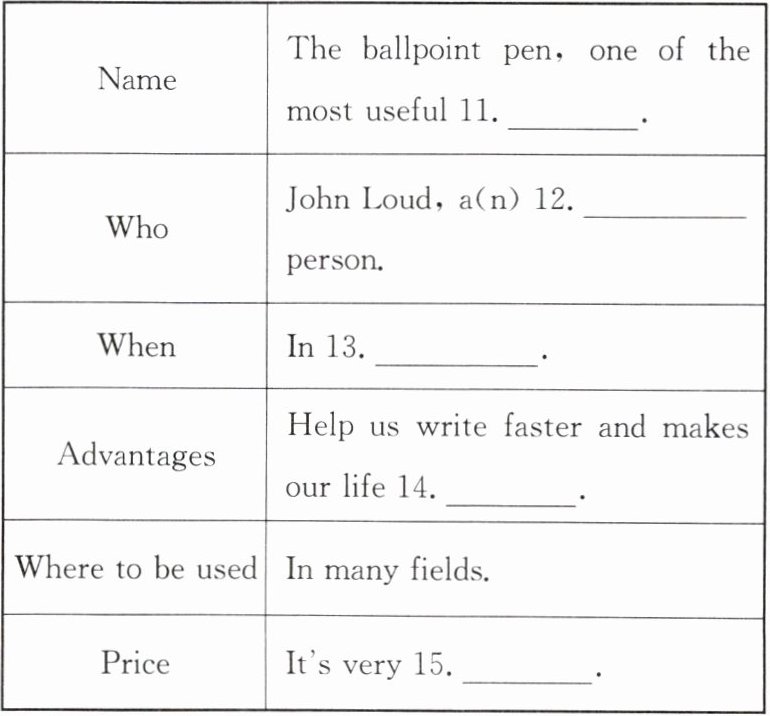 (三)听力填词:请听下面一段独白。根据所听到的内容,写出可以填入下表11至15空格中的适当单词,每空限填一词。(独白读两遍)