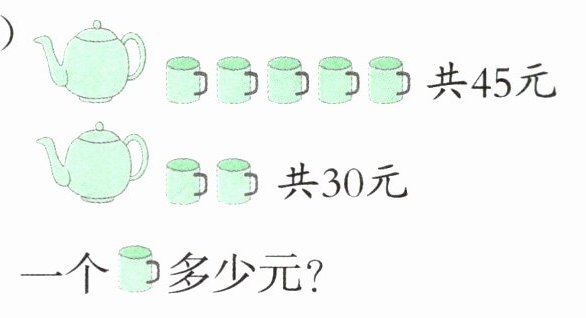 (2)5-2=3(个);(45-30)÷3=5(元)【提示】因为茶壶数相同,所以用价钱之差除以茶杯数之差,就是茶杯的单价。