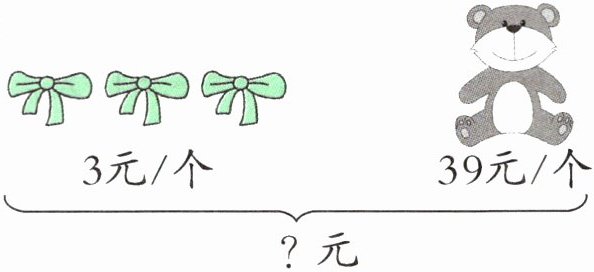 (1)3×3+39=48(元)【提示】先用3乘3,求出3个蝴蝶结的价钱,再加上一个小熊玩具的价钱即可。