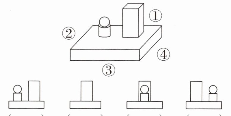 4.③ ④ ② ① [提示]从①的位置看到左边长方形、右边圆和正方形;从②的位置看到圆和正方形遮住长方形的一部分;从③的位置看到左边圆和正方形、右边长方形;从④的位置只看到长方形。