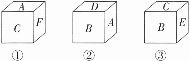 7. 新考法 规律探究 一个正方体的六个面上分别写着A、B、C、D、E、F。从不同的角度观察,各字母的位置如下图所示。这个正方体相对的两个面上的字母分别是什么?