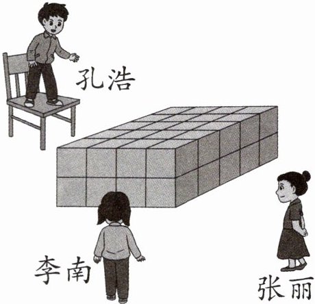 5.2×4 8 4×5 20 2×5 10 [提示]李南从前面观察,看到2行小正方形,每行4个,共2×4=8(个)小正方形;孔浩从上面观察,看到4行小正方形,每行5个,共4×5=20(个)小正方形;张丽从右面观察,看到2行小正方形,每行5个,共2×5=10(个)小正方形。