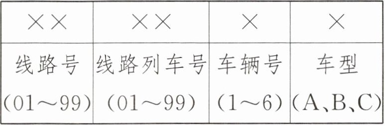 |线路号(01~99)|线路列车号(01~99)|车辆号(1~6)|车型(A、B、C)|
