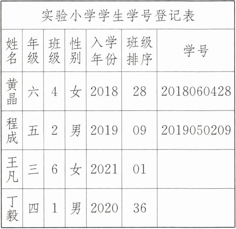 4. 下面是实验小学部分学生学号登记表。请你总结该学校学号编排的规律,给没有学号的学生编上学号。