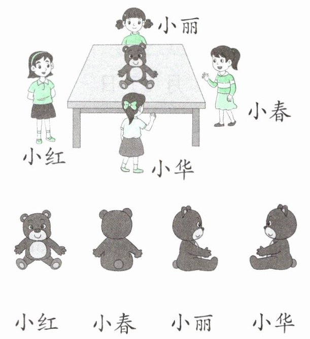 [提示]小华看到的是熊的正面;小丽看到的是熊的背面;小红看到的是熊的侧面,且脸朝右;小春看到的是熊的侧面,且脸朝左。