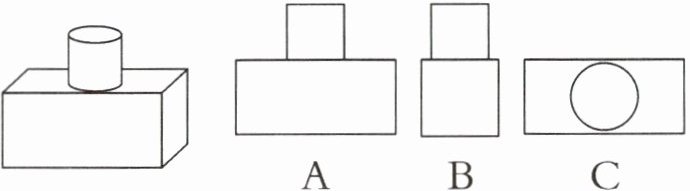 C A B [提示]从上面看到的是一个长方形中间有一个圆;从前面看到的是一个大长方形在下层,一个小正方形在上层;从侧面看到的是一个大正方形在下层,一个小正方形在上层。