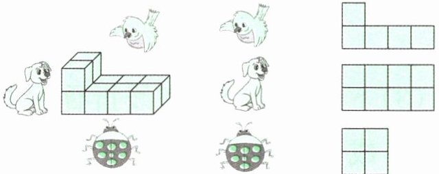 [提示]小鸟从上面看到8个小正方形;小狗从左面看到4个小正方形;瓢虫从前面看到5个小正方形。