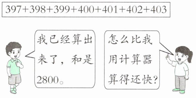 397=400-3,398=400-2,399=400-1,401=400+1,402=400+2,403=400+3,原来的算式等于7个400相加的和,400×7=2800。【提示】7个连续自然数相加的和,等于中间数的7倍。