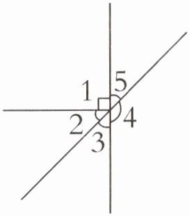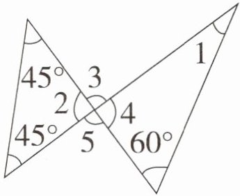 【提示】由图可知,∠1+∠2+∠3=180°,且∠1=90°,∠2=∠3,所以∠3=(180°-90°)÷2=45°。∠4=180°-∠3=180°-45°=135°。又因为∠3+∠4=∠4+∠5=180°,所以∠5=∠3=45°
