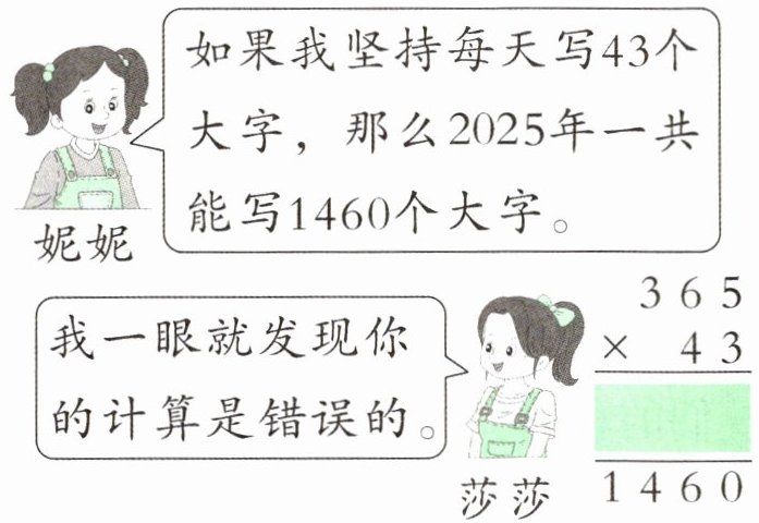 3.5×3=15,积的个位上应该是5,而妮妮写的是0,所以计算错误。(答案不唯一,合理即可)