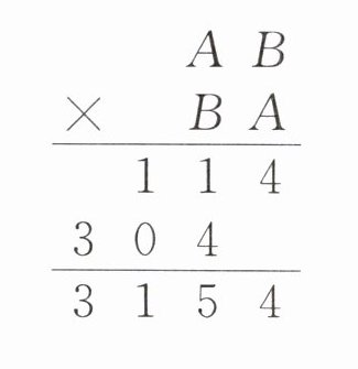 A + B=11 [提示]由AB×A=114,AB×B=304可知“B×B”的积的末位是4,“A×B”的积的末位也是4,B可取2或8,对应的A可取2、7或3、8。因为A≠B,所以对应组合应为A是7、B是2或A是3、B是8。因为38×83=3154,所以A为3,B为8,A + B=3 + 8=11。
