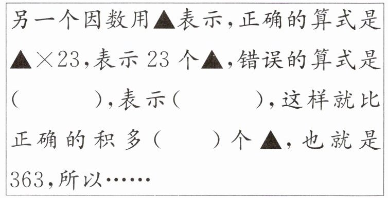 |另一个因数用▲表示,正确的算式是▲×23,表示23个▲,错误的算式是(