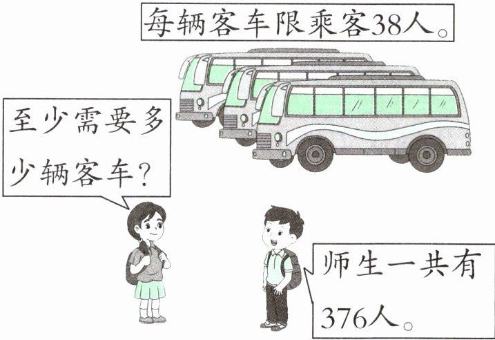 376÷38=9(辆)……34(人) 9+1=10(辆) 【提示】余下的34人也需要一辆车,因此需要的车辆数应该用商加1。
