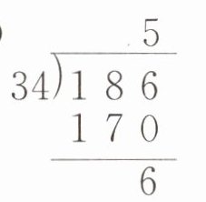 (3)$\begin{array}{r} 5\\ 34\enclose{longdiv} {186}\\ 170\\ \hline 6\end{array} $