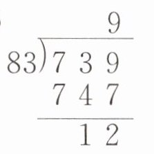 (1)$\begin{array}{r} 9\\ 83\enclose{longdiv} {739}\\ 747\\ \hline 12\end{array} $
