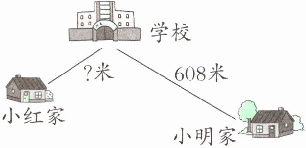 608÷76=8(分钟) 73×(8-4)=292(米) 【提示】根据“路程÷速度=时间”先算出小明走的时间,那么小红走的时间是:8-4=4(分钟),再根据“速度×时间=路程”算出小红家到学校的距离。