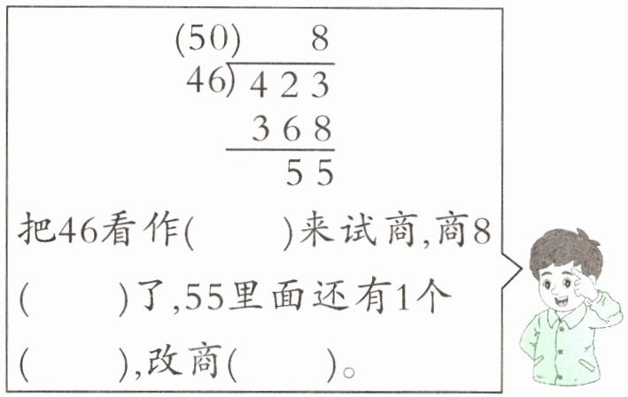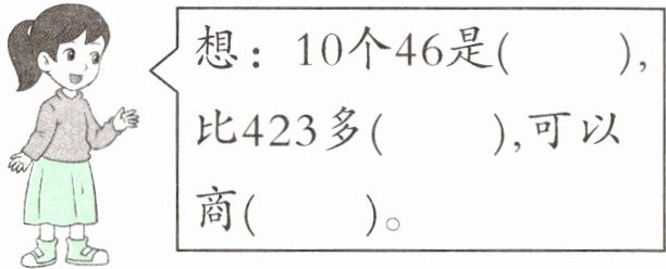 9……9 50 小 46 9 460 37 9 竖式及验算略 【提示】根据小男孩的试算过程及小女孩的思路过程填空即可,根据“商×除数+余数=被除数”进行验算。