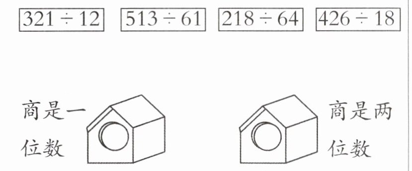 [提示]三位数除以两位数﹐被除数前两位大于或等于除数﹐商是两位数﹔被除数前两位小于除数﹐商是一位数。