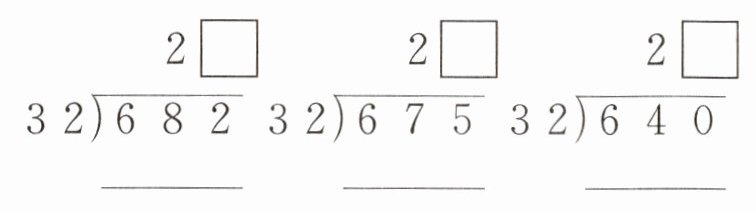 $\begin{array}{r} 2□\\ 32\enclose{longdiv} {682}\\ \hline \end{array}\\ \hline $ $\begin{array}{r} 2□\\ 32\enclose{longdiv} {675}\\ \hline \end{array}\\ \hline $ $\begin{array}{r} 2□\\ 32\enclose{longdiv} {640}\\ \hline \end{array}\\ \hline $