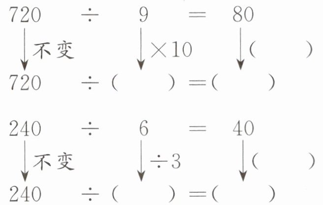 (4)240 除以10 乘3 90 ÷10 8 2 ×3 120 乘或除以这个数 除以或乘这个数 【提示】根据商的变化规律填空。