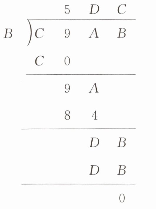 第一步:2<9,因此 2 减 B 时应借位,由 12-B= 9,得 B= 3。