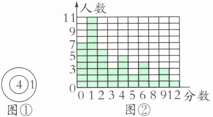 3. 一批同学参加飞镖比赛,每人发三镖。图①是靶标,靶标上的数字4和1表示射中该靶区的得分,没射中的得0分。图②是这次比赛的得分统计图,根据图中信息填空。