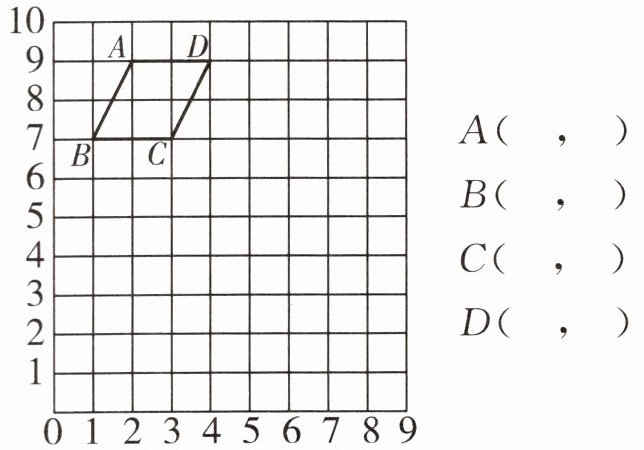 (2)画出平行四边形 ABCD 先向右平移 3 格,再向下平移 6 格后得到的新平行四边形 A'B'C'D',并用数对表示各顶点的位置。