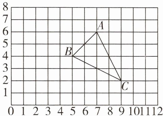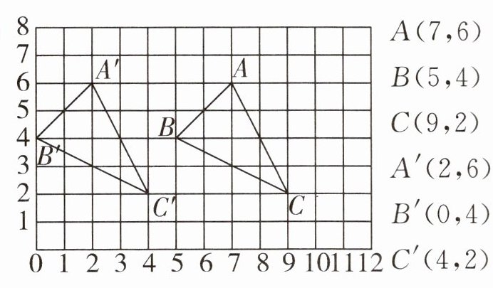 三角形$ABC$三个顶点用数对表示为$A(7,6)$,$B(5,4)$,$C(9,2)$,向左平移$5$格,行不变,列减$5$,分别得到$A'(2,6)$,$B'(0,4)$,$C'(4,2)$。