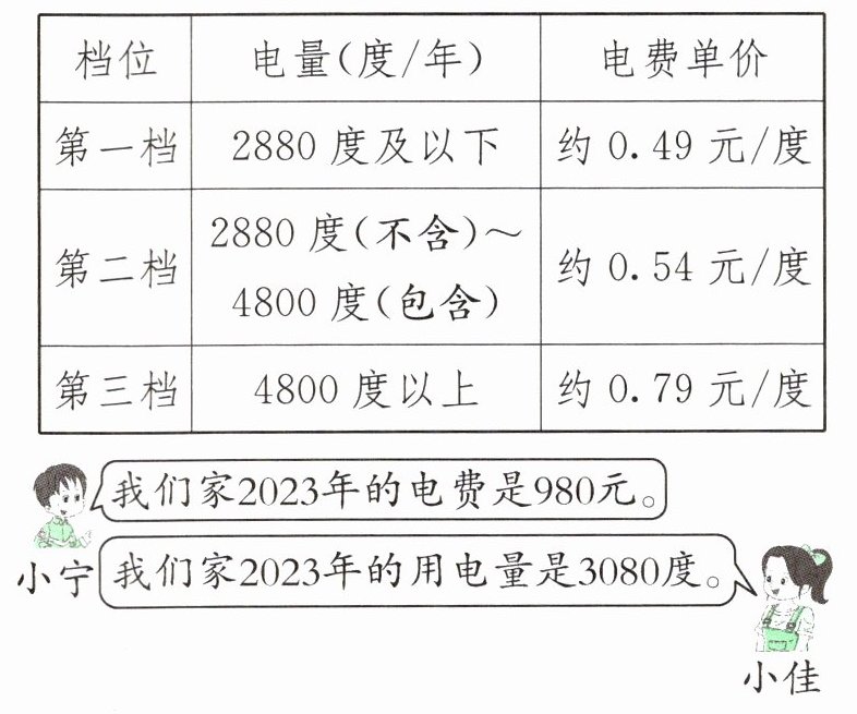 [提示]2880<3080<4800,要先算出第一档的价钱:2880×0.49=1411.2(元),再算出第二档的价钱:(3080-2880)×0.54=108(元),最后把两个档位的钱相加就是小佳家2023年用电的总费用。