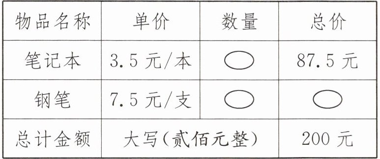 1.(广东深圳宝安区)班级学习用品采购清单(如下表)被弄脏了。分别求笔记本和钢笔购买的数量。