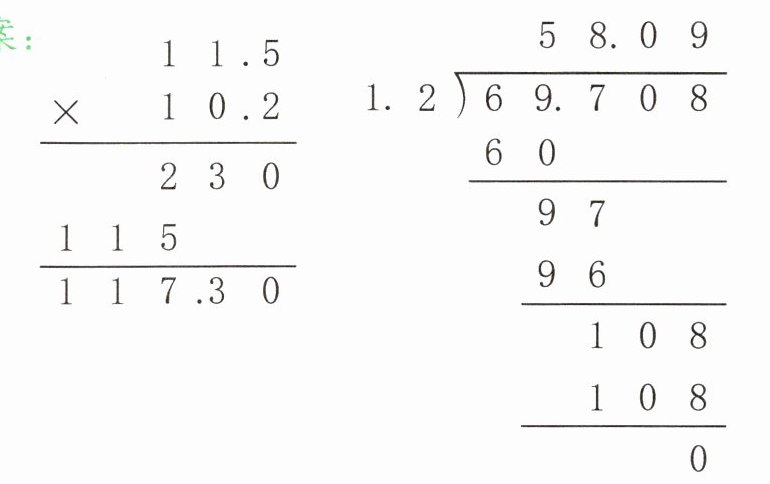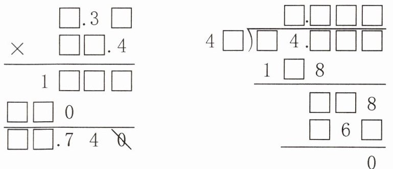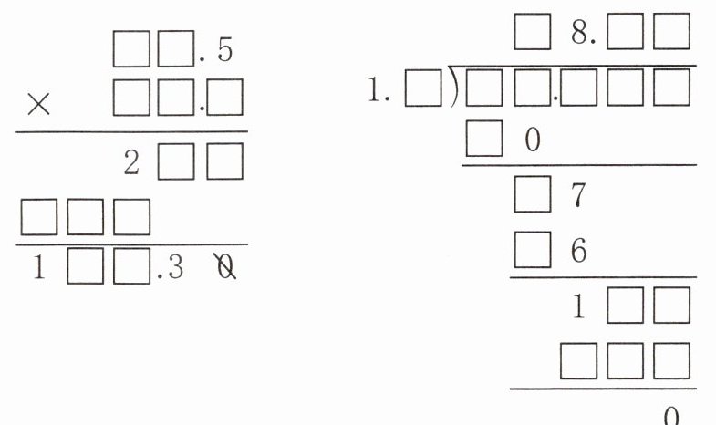 乘法竖式,由末尾是$1□□.30可以推出2□□$为230,则$□□.5$为11.5,又由上可得出第二个因数为10.2。除法竖式,由商的个位上是8,可以推出除数为1.2,且商的首位是5,被除数的首位是6,即可知$□0$为60。因为$12×8= 96$,所以$□6$为96,$□7$为97。由除法的最后一步可知$1□□$为12的倍数,所以$1□□为12×9= 108$。