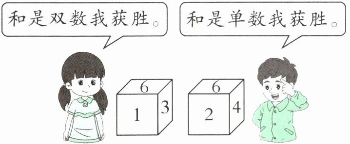 (3)小明胜的可能性大。因为每掷1次,总点数是7的情况有6种,总点数是5的情况有4种。所以掷20次,总点数是7的可能性大于总点数是5的可能性,即小明胜的可能性大。[提示]骰子每个面上的点数分别为1~6。