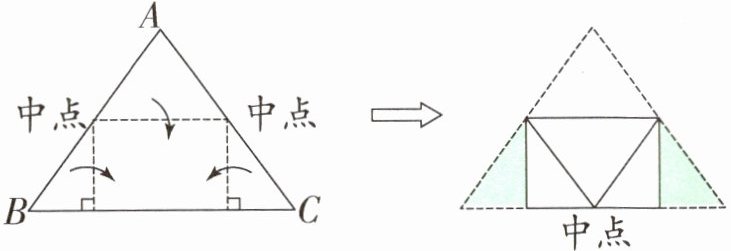 [提示]将等腰三角形ABC沿虚线对折,折下来的部分恰好拼成了一个长方形,这个长方形的长等于三角形ABC底的一半,高等于三角形ABC高的一半,所以长方形的面积等于三角形ABC面积的一半;图中涂色部分的面积等于长方形内两个小三角形的面积和;长方形内两个小三角形的面积和等于长方形面积的一半,所以图中涂色部分的面积等于三角形ABC的面积除以4。