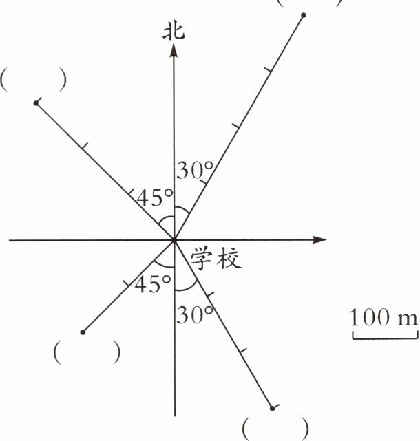 (3)少年宫在学校的东偏南$45^{\circ}$方向600 m处。