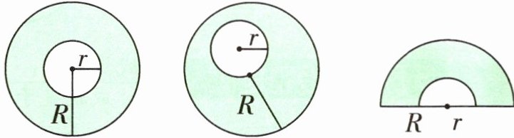 第三个图形:涂色部分是一个半圆环,其面积不能用公式$π(R^2-r^2)$直接计算,而是需要除以2或者用其他方法计算。