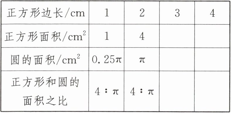 ||圆的面积/$\text{cm}^2$|$0.25\pi$|$\pi$|