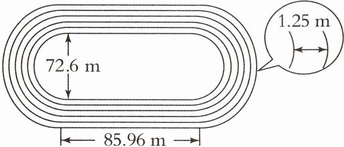 【提示】跑道的两个半圆之间的部分是2段长为85.96m的直道;第一道是最里面的半圆,直径是72.6m,第二道比第一道增加两个1.25m,所以往外每条半圆形跑道的直径都比前一条半圆形跑道的直径长两个1.25m。